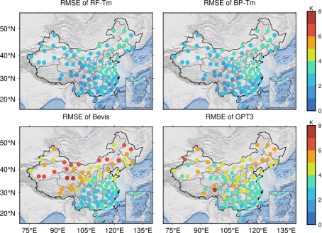 图2 不同模型在中国87个无线电探空站的均方根误差(RMSE)分布