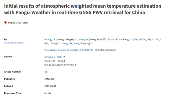 近日,我院黄良珂教授团队发表的论文入选全球ESI高被引论文,论文题目为“Initial results of atmospheric weighted mean temperature estimation with Pangu-Weather in real-time GNSS PWV retrieval for China”,于2025年1月发表在《GPS Solutions》(Liangke Huang, Yicai Wang, Haohang Bi, Ge Zhu, Lilong Liu, Weiping Jiang. 2025, 29, 48)期刊。GPS Solutions是卫星导航领域的国际权威期刊,最新中国科学院分区为SCI一区Top。